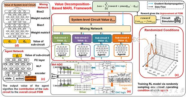 对于更复杂的系统级模拟电路设计,曾璇团队提出了多智能体强化学习(MA-RL)方法,并使用AI实现。该方法将整个电路按拓扑结构自动划分为多个子模块,并为每个子模块配备了一个具备自主优化与协同通信能力的AI智能体,能理解整体性能与局部设计的关系,实现系统整体最优。