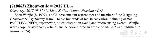 今年9月,国际天文学联合会公布了第5卷第20号《小天体命名工作组公告》(WGSBN Bulletin,Volume 5,#20),其中,第718863号小行星以复旦大学中国语言文学系2019届本科、2022届硕士校友周文杰的名字命名。