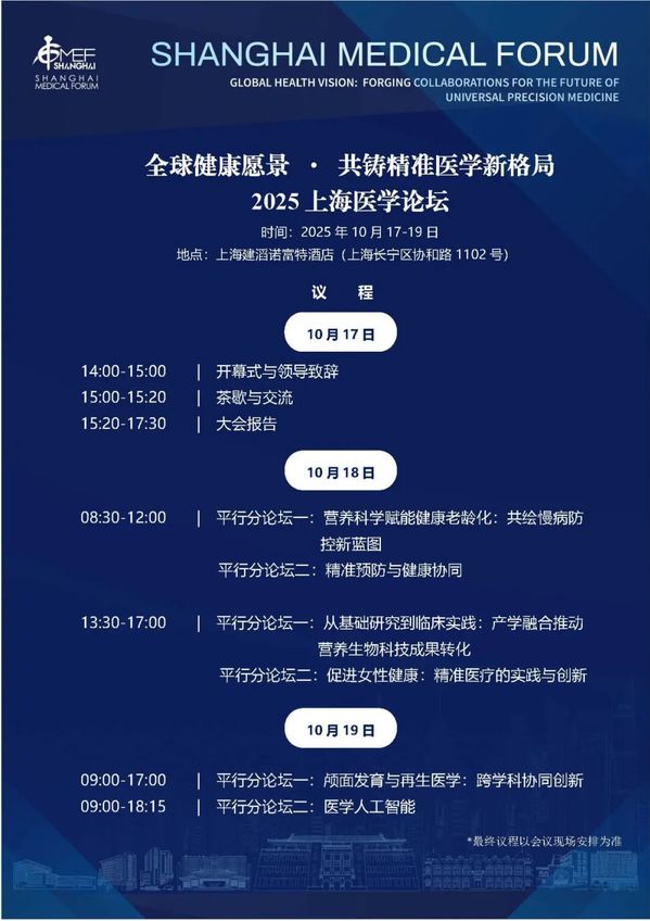 由复旦大学上海医学院主办、面向全球医学界开放合作的国际性高端学术平台——2025上海医学论坛(Shanghai MEF),将于10月17日至19日在上海举行。作为我国医学领域首个以“科技前沿与创新”为核心定位的国际高端品牌会议,该论坛自2022年创立以来,始终秉持“聚全球智慧·解人类健康之问”的宗旨,汇聚全球医学专业人士、科学家、研究人员及行业领袖,交流分享医学与健康领域的前沿知识、实践经验和创新成果,已成为连接基础研究、临床转化与公共卫生政策的重要桥梁。