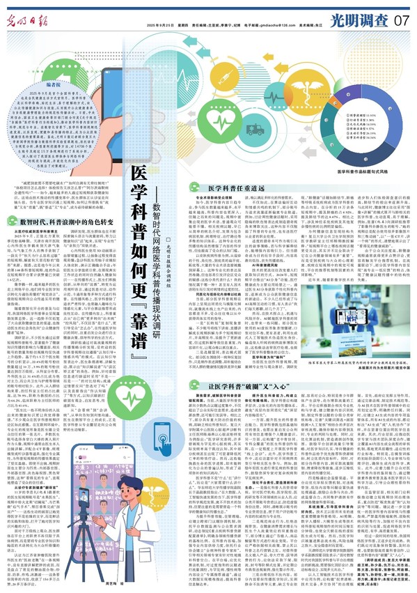 【编者按】2025年9月是首个全国科普月,也是全民健康生活方式宣传月。医学科普是以科学准确、贴近生活、易于理解的方式,向公众传播健康知识与技能,从而提升公众健康素养与自我健康管理能力的规范性传播活动。日前,中央网信办、国家卫生健康委等四部门联合印发《关于规范“自媒体”医疗科普行为的通知》,推动医学科普内容回归科学、规范与专业。在数智化背景下,医学科普短视频迅速发展,以其直观、便捷和易传播的特点,成为公众获取健康信息的重要渠道。鉴此,光明日报记者联合复旦大学新闻学院传播与数据科学实验室课题组,依托语音与视觉分析、典型案例挖掘等方法,对14706个医生账号及超过15万条视频进行了系统分析,深入探讨了我国医生群体参与网络科普的现状与挑战,并就优化内容生态提出了对策建议。
