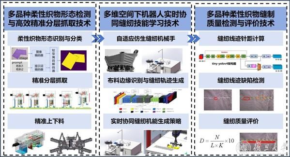 我国是全球第一大服装生产国与出口国,当前,服装行业亟需从“劳动密集型”向“技术密集型”转型。其中,作为服装生产核心环节的缝纫工艺自动化,成为推动产业升级的关键突破口。然而,与磨削焊接、搬运等处理刚性物体的工业机器人不同,缝纫操作的对象是柔软、易变形、弹性各异的布料,其自动化被公认为机器人领域的“最后硬骨头”,既是学术研究的前沿,也是制约行业发展的核心瓶颈。复旦大学智能机器人研究院技能型工艺机器人团队在院长甘中学教授的指导下,由孙云权教授、齐立哲研究员牵头自2018年开始,在季华实验室的支持下,持续开展该领域的技术攻坚,逐步构建起了涵盖多品种柔性织物形态检测与高效精准分层抓取、多维空间下机器人实时协同缝纫技能学习、多品种柔性织物缝制质量检测与评价在内的完整技术体系。