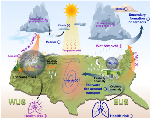 图 考虑火的热量后,美国西部野火降低东部污染的机理示意图