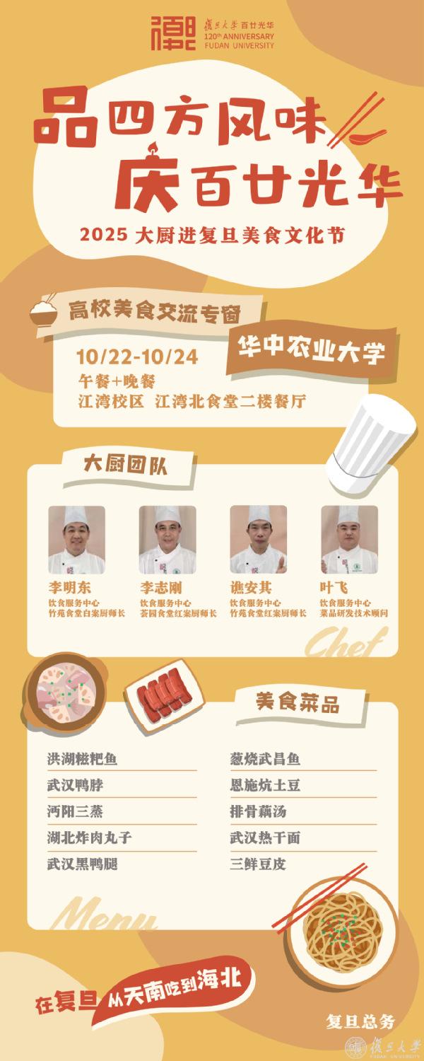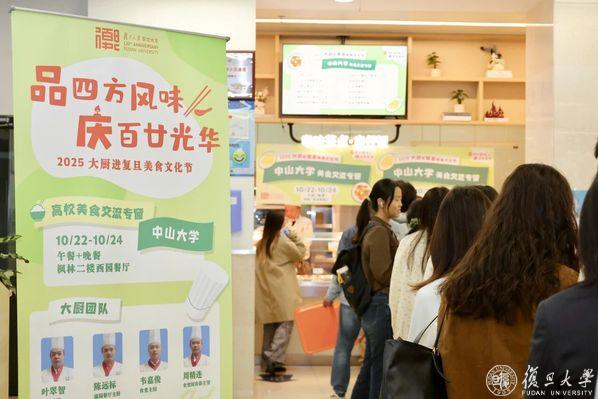 10月22日起至10月24日,品四方风味,庆百廿光华——2025“大厨进复旦”美食文化节高校交流专窗全面开放,将在午餐和晚餐时段持续供应美食,快来四校区食堂一站式尝遍天南海北。