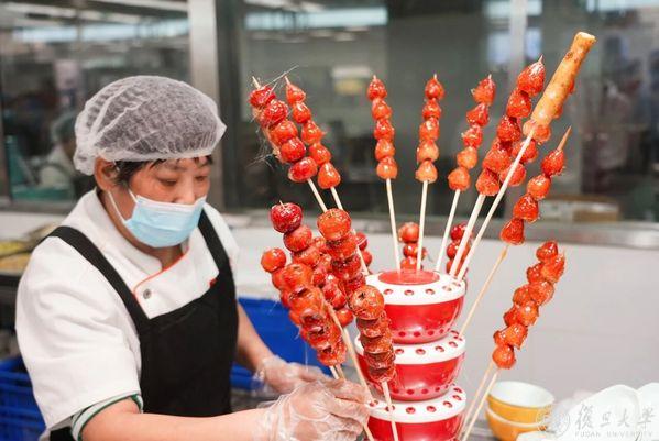 上午10点半,旦苑食堂一楼,北京大学的窗口已排起长队。师傅们现场制作的冰糖葫芦成为最大亮点,晶莹剔透的糖衣包裹着红艳的山楂,酸甜可口。一抹亮红色,招徕路过师生源源不断的注目问询。