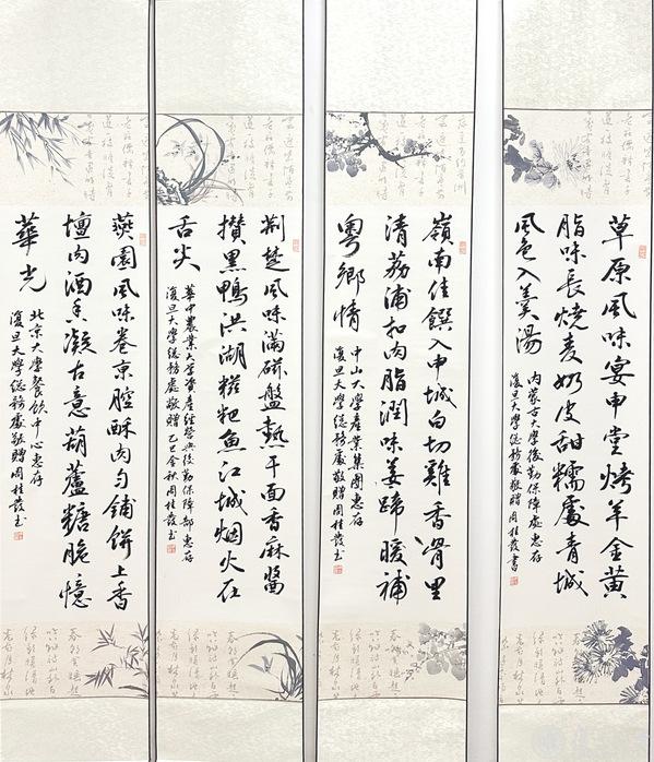 为感谢各位大厨携美食与文化而来,复旦也准备了一份特别的礼物。老干部党委书记、退休工作处处长周桂发老师,亲笔为四所高校的大厨团队题写了四幅书法作品。这些作品均以“七言绝句”形式创作,巧妙地将各校的招牌菜名融入诗中,以翰墨凝香,致敬四方风味。这份雅致赠礼,将舌尖风味升华为笔尖诗意,成为此次美食文化节中最富人文温度的注脚。