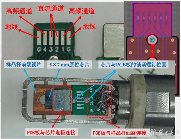 维恩分离器是并行束扫描电子显微镜的电子光路中的核心部件,可以直接将入射电子与二次电子进行分离,是多束成像的基础。为了支持并行束扫描电子显微镜的开发,中心自行研发的多物理场耦合原位测试样品杆被用于对维恩分离器的核心材料进行分析,探索了多种成分的高磁导率合金在温度、磁场、电场作用下的稳定性和杂散场特性。这些研究结果不仅服务于复旦校内,也推动了国产高端电镜设备的技术进步。