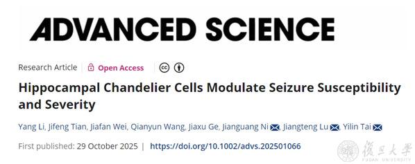 2025年10月29日,复旦大学脑科学研究院邰一琳、倪剑光课题组在《先进科学》(Advanced Science)在线发表题为“海马吊灯样细胞调控癫痫发作易感性与严重度(Hippocampal Chandelier Cells Modulate Seizure Susceptibility and Severity)”的研究论文。该研究综合利用新型遗传学工具、在体钙信号记录、化学遗传学干预及形态学分析等手段,发现海马CA1区ChCs在癫痫发作时对网络过度激活做出了响应,抑制ChCs活动会增加癫痫易感性并加剧癫痫发作,而激活其活动则能缓解症状,系统地阐明了海马CA1区ChCs在癫痫发作中起到的内源性保护作用。