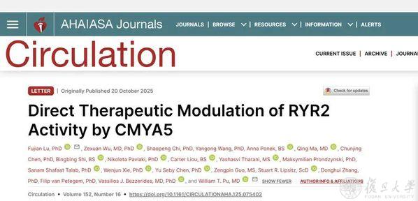 2025年10月20日,复旦大学生物医学研究院、附属中山医院上海心研所的路福建和哈佛医学院波士顿儿童医院的William Pu合作,在《循环》(Circulation)发表题为“Direct Therapeutic Modulation of RYR2 Activity by CMYA5”的文章。该研究解析了CMYA5蛋白稳定RYR2通道活性的关键互作片段(RYR2 interaction domain, RID)并设计出一种可通过腺相关病毒(AAV)载体递送的治疗性多肽CMYA5RID。心脏特异性递送CMYA5RID有效阻断RYR2病理性激活,显著抑制心律失常的发生,为CPVT基因治疗提供了全新的策略,并显示出在获得性心力衰竭、心房颤动等伴随RYR2失调疾病中的潜在应用价值。