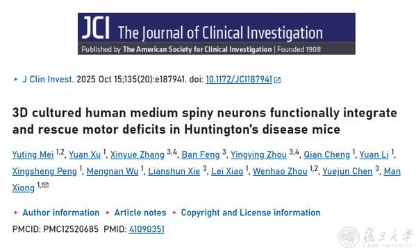 2025年10月15日,复旦大学脑科学研究院熊曼课题组在《临床研究杂志》(Journal of Clinical Investigation)在线发表了题为“3D培养的人源中型多棘神经元能够功能性整合进亨廷顿病小鼠的神经环路并改善其运动缺陷(3D-cultured human medium spiny neurons functionally integrate and rescue motor deficits in Huntington’s disease mice)”的研究论文。研究首次建立了人多能干细胞高效定向分化为纹状体中型多棘神经元(MSN)亚型的三维悬浮培养新技术,分化的细胞在分子特征上与胎脑内源神经元高度相似;移植实验进一步证实,这些来源于人多能干细胞的MSN亚型能够在结构与功能层面整合入亨廷顿病(Huntington’s Disease, HD)模型小鼠的基底神经节环路的直接通路和间接通路,显著改善HD小鼠的运动功能障碍,为基于神经环路重建的HD的细胞替代治疗提供了全新技术途径和理论基础。