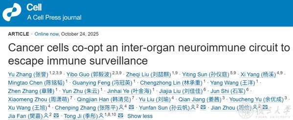 2025年10月24日,复旦大学附属中山医院樊嘉、季彤、周俭、孙云帆及上海交通大学医学院附属第九人民医院张陈平合作在《细胞》(Cell)上发表了题为“Cancer cells co-opt an inter-organ neuroimmune circuit to escape immune surveillance(肿瘤细胞利用跨器官神经免疫轴逃避免疫监视)”的研究论文。研究首次揭示了免疫压力下的肿瘤细胞,可“劫持”感觉神经远程抑制引流淋巴结(TDLN)中的系统性抗肿瘤免疫应答,从而实现免疫逃逸。阻断这种神经介导的肿瘤-TDLN通讯不仅显著增强免疫治疗疗效,也能显著抑制癌痛。