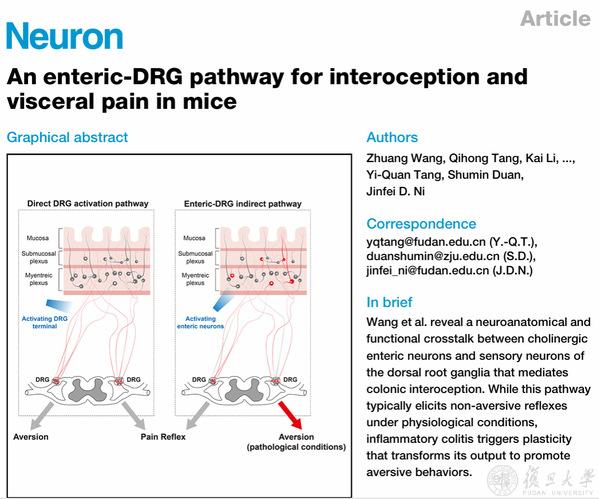 2025年10月24日,复旦大学脑科学转化研究院倪金飞课题组在《神经元》(Neuron)上发表了题为“ An enteric—DRG pathway for interoception and visceral pain in mice ”的研究论文。研究发现小鼠肠道-背根神经节(DRG)传入神经在远端结肠与肠神经元广泛关联,分布于胃肠道等多器官且终端形态特殊;光遗传学激活显示,结肠支配DRG不同亚型引发不同伤害性行为反应,胆碱能肠神经元经DRG-脊髓通路触发非厌恶反射(乙酰胆碱为关键信号);炎症会使该通路从非厌恶转为厌恶,且炎症恢复期仍持续,此发现拓展了DRG介导内脏感觉的认知,为内脏疼痛研究提供方向。