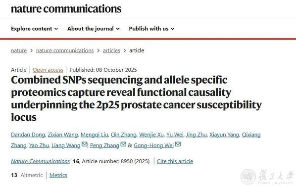 2025年10月8日,复旦大学基础医学院生物化学与分子生物学系卫功宏团队在《自然-通讯》(Nature Communications)期刊上发表了题为“Combined SNPs sequencing and allele specific proteomics capture reveal functional causality underpinning the 2p25 prostate cancer susceptibility locus”的研究论文。该研究通过整合高通量SNPs-seq技术与等位基因特异性蛋白质组学分析,系统解析了前列腺癌风险位点2p25的功能机制,首次揭示了转录因子USF1通过结合风险等位基因rs4519489-A上调致癌基因NOL10的表达,进而驱动前列腺癌进展的分子通路。