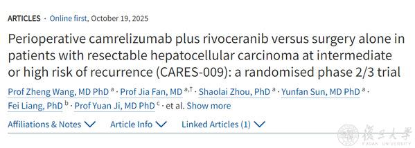2025年10月19日,复旦大学附属中山医院樊嘉、周俭团队在《柳叶刀》(The Lancet)发表了题为“卡瑞利珠单抗联合阿帕替尼用于可切除肝细胞癌伴中高危复发风险患者的围手术期治疗:一项多中心、开放、随机对照2/3期研究(CARES-009)(Perioperative camrelizumab plus rivoceranib versus surgery alone in patients with resectable hepatocellular carcinoma at intermediate or high risk of recurrence (CARES-009): a randomised phase 2/3 trial)”的临床研究成果,首次填补了肝癌患者围手术期新辅助治疗方案的空白。研究表明,与单纯手术相比,围手术期卡瑞利珠单抗联合阿帕替尼显著改善了可切除的中高复发风险肝细胞癌患者的无事件发生生存期。