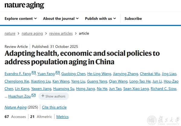 2025年10月31日,复旦大学公共卫生学院邹华春联合挪威奥斯陆大学方飞、方圆、瑞典哥德堡大学吴晶等30余位来自不同国家和地区的专家共同在《自然-衰老》(Nature Aging)发表了题为“Adapting health, economic and social policies to address population aging in China”的综述文章,综述了我国在人口老龄化领域的相关进展、挑战及潜在应对方案,总结了中国当前在促进普通人群健康长寿方面的各项政策,重点关注社会医疗保险、长期护理保险(LTCI)、社区与居家养老、姑息治疗、老年医学研究、公共卫生预防以及营养与医疗干预等领域,并分析了其中的优势与不足。