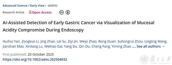 2025年10月20日,复旦大学药学院李聪、游艳,浙江大学医学院附属第二医院蔡建庭联合研究团队,在《先进科学》(Advanced Science)发表了题为 “AI-Assisted Detection of Early Gastric Cancer via Visualization of Mucosal Acidity Compromise During Endoscopy”的研究论文。团队构建了 “pH 比率响应拉曼阵列”,并结合 AI光谱处理技术打造了术中检测系统,该系统通过将胃黏膜 pH分布与形态学特征相结合,能准确区分 “癌与非癌”组织,快速锁定病灶,既避免因形态相似导致的假阳性,为内窥镜黏膜下剥离术(ESD)手术提供精准导航。