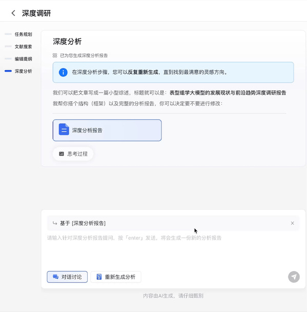 比如选择深度调研,接下来只需清晰描述你关心的课题,比如“表型组学大模型的发展现状与前沿趋势深度调研报告”。