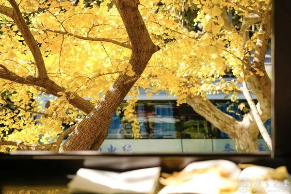 路过二教的银杏教室, 窗户变成天然的画框。 窗外的银杏正把阳光筛成碎金, 细碎的光影里, 偷藏着一个温柔的、关于秋天的梦。