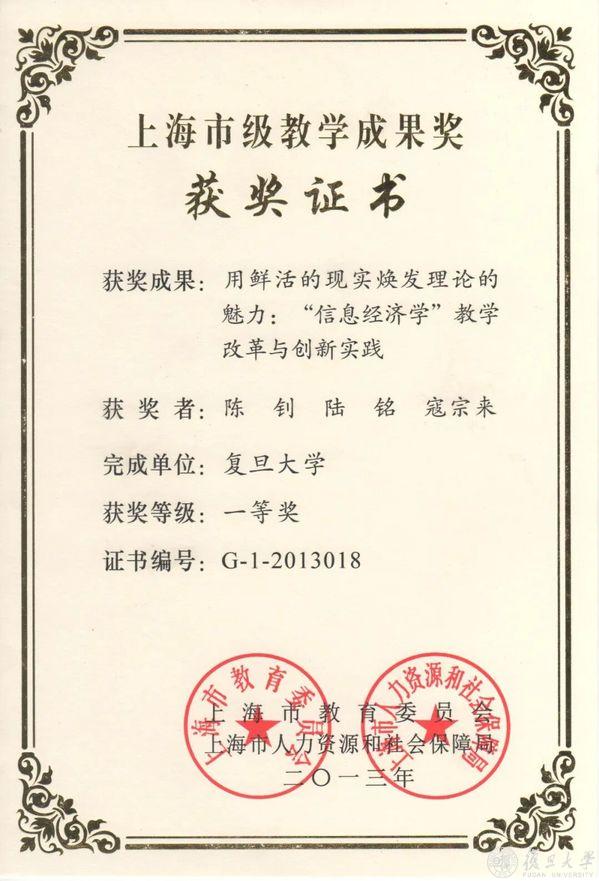信息经济学课程获“上海市教育成果一等奖”证书
