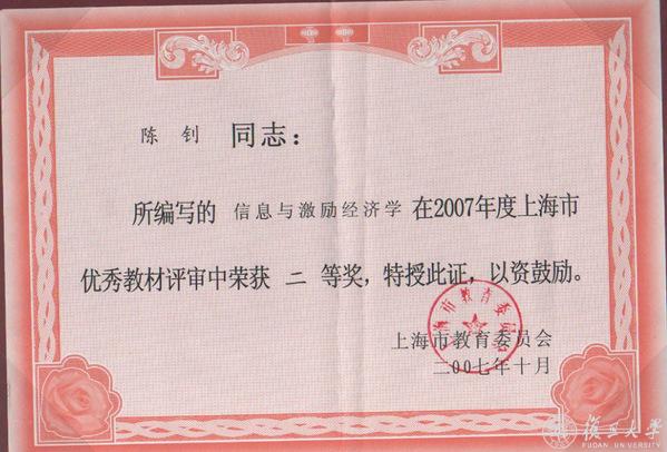 《信息与激励经济学》获“上海市高校优秀教材二等奖”证书