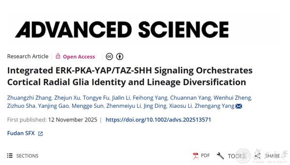 2025年11月12日,复旦大学脑科学研究院杨振纲课题组在《先进科学》(Advanced Science)杂志上发表题为“Integrated ERK-PKA-YAP/TAZ-SHH Signaling Orchestrates Cortical Radial Glia Identity and Lineage Diversification”的研究论文。该文章揭示了ERK/PKA、YAP/TAZ和SHH信号通路通过相互抑制作用,共同调控大脑皮质的神经发生、胶质发生、以及进化扩张。这项研究不仅阐明了小鼠和人类大脑发育所遵循的共同保守机制,还阐明了ERK信号通路是进化过程中大脑皮质扩张的根本驱动因素。