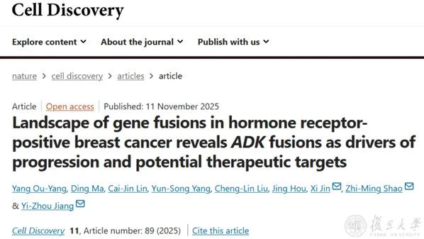 2025年11月11日,复旦大学附属肿瘤医院邵志敏、江一舟、金希等在《细胞发现》(Cell Discovery)发表题为“Landscape of gene fusions in hormone receptor-positive breast cancer reveals ADK fusions as drivers of progression and potential therapeutic targets”的研究成果,证实了 ADK 融合基因是 HR+/HER2- 乳腺癌的治疗新靶点,从而为患者群体提供了创新精准治疗策略的新途径。