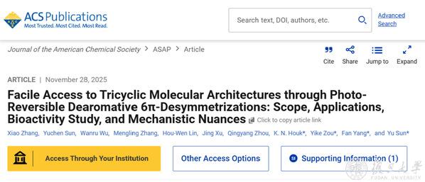 2025年11月28日,复旦大学药学院孙域课题组在《美国化学会志》(Journal of the American Chemical Society)发表了题为“Facile Access to Tricyclic Molecular Architectures through Photo-Reversible Dearomative 6π-Desymmetrizations: Scope, Applications, Bioactivity Study, and Mechanistic Nuances”的研究论文。课题组通过合理设计反应底物,成功发展了一种具有合成实用性的光可逆去对称化、去芳构化6π电环化反应。在310nm波段下,多烯前体i可一步反应转化为多环化合物iv;而在450nm下,多环化合物iv可发生逆向反应,得到顺式的多烯化合物ii(图1B)。该反应具有广泛的应用前景,其根据底物取代基(R1、R2 = H or alkyl)的不同,可实现四类多环化合物的高效、简洁合成。该合成方法有望应用于jaborosalactone 15等多类复杂天然产物的全合成中。