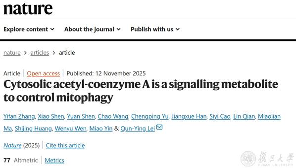 2025年11月13日,复旦大学上海医学院雷群英团队在《自然》(Nature)在线发表题为“Cytosolic acetyl-coenzyme A is a signalling metabolite to control mitophagy”的研究论文。这项历经近十年探索的研究,首次揭示了乙酰辅酶 A 作为“代谢信使”的非经典功能,突破传统认知发现其可直接调控线粒体自噬,并且为克服胰腺癌 KRAS 抑制剂耐药提供了全新治疗靶点,在代谢生物学与肿瘤学交叉领域取得突破性进展。