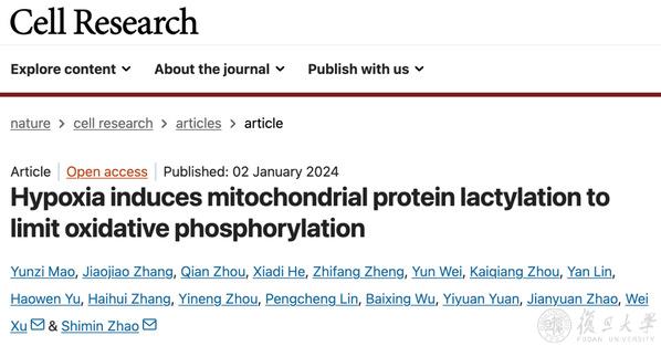 赛诺菲-Cell Research 2024年度杰出论文奖2025年11月,赛诺菲-Cell Research 2024年度杰出论文奖发布,共3篇发表于《细胞研究》(Cell Research)的研究论文获奖。复旦大学附属妇产科医院赵世民、徐薇合作发表的题为 “Hypoxia Induces Mitochondria Protein Lactylation to Limit Oxidative Phosphorylation“ 的研究论文入选。
