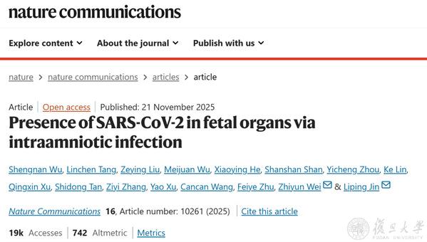 2025年11月21日,复旦大学附属妇产科医院金莉萍团队在《自然-通讯》(Nature Communications)上发表了题为“Presence of SARS-CoV-2 in fetal organs via intraamniotic infection”的研究。该研究首次全面绘制了SARS-CoV-2病毒在胎儿体内的分布图谱,证实该病毒能够通过母胎垂直传播,感染孕妇子宫内的胎儿,并可能对其多个器官造成影响,为了解孕期新冠感染对胎儿健康的潜在风险提供了至关重要的科学证据。