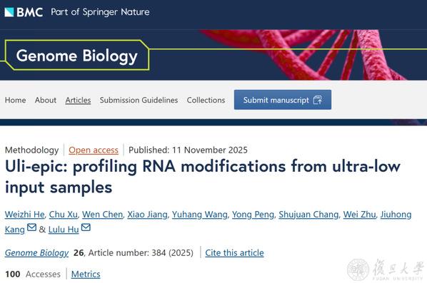 2025年11月11日,复旦大学生物医学研究院胡璐璐课题组联合同济大学康九红课题组在《基因组生物学》(Genome Biology)发表题为“Uli-epic: profiling RNA modifications from ultra-low input samples”的研究论文,联合开发了一种创新的文库构建策略Uli-epic,该策略结合了化学基础的RNA修饰检测技术,可在极低量的RNA样本中精确检测表观转录组修饰。