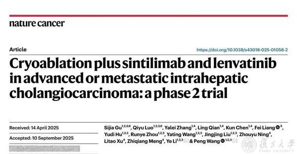 2025年11月2日,复旦大学附属中山医院王鹏、李烨团队在《自然-癌症》(Nature Cancer)在线发表了题为“冷冻消融联合信迪利单抗和仑伐替尼治疗晚期/转移性肝内胆管癌(Cryoablation plus sintilimab and lenvatinib in advanced or metastatic intrahepatic cholangiocarcinoma: a phase 2 trial)”的Ⅱ期临床研究结果。该方案针对一线治疗失败的晚期肝内胆管癌患者,将客观有效率(ORR)从既往约5%显著提升至75%,中位无进展生存期(PFS)从2-4个月提升到16.8个月,总生存期(OS)达25.4个月,且安全性良好,这一成果不仅是我国肝胆肿瘤领域原创性突破的重要体现,更为全球晚期胆管癌治疗提供了新思路。