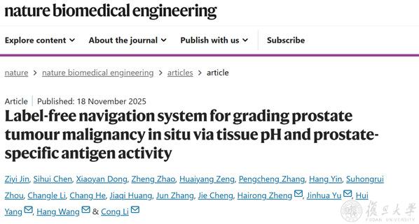 2025年11月18日,复旦大学药学院李聪团队联合中国科学院深圳先进技术研究院医学成像科学与技术系统全国重点实验室郑海荣、杨慧团队,复旦大学附属中山医院泌尿外科王杭,复旦大学生物医学工程学院余锦华,共同在《自然-生物医学工程》(Nature Biomedical Engineering)杂志发表题为“Label-free Navigation System for in-situ Grading Prostate Tumor Malignancy via Tissue pH and Prostate-Specific Antigen Activity”的研究性论文。该工作开发了一类基于表面增强拉曼散射(SERS)技术的肿瘤切除导航设备,该设备集成了微流控采样、拉曼阵列检测、AI光谱分析模块。采样模块通过纯水水滴无损、连续提取手术切缘表面物质,继而转移到纳米压印技术制备的拉曼阵列。