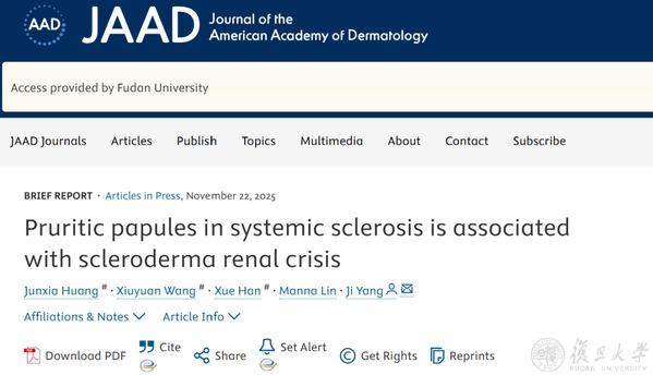 2025年11月22日,复旦大学附属中山医院皮肤科杨骥团队在《美国皮肤病学会杂志》(Journal Of The American Academy Of Dermatology)在线发表题为“系统性硬化症患者的瘙痒性丘疹与硬皮病肾危象相关(Pruritic papules in systemic sclerosis is associated with scleroderma renal crisis)”的研究论文。研究团队基于长期大量临床患者的分析、对比、随访和总结,首次揭示了一种特征性皮疹可成为系统性硬化症肾危象的早期预警信号。借助这一发现实现疾病的早诊早治,能有效提高这类患者的生存率。