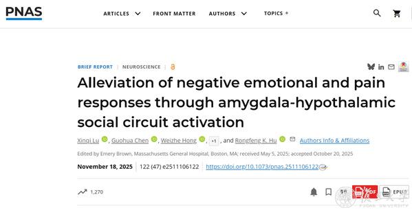 2025年11月18日,复旦大学脑科学转化研究院胡荣峰与复旦大学附属中山医院黄啸在《美国科学院院报》(PNAS)上发表了题为“Alleviation of negative emotional and pain responses through amygdala-hypothalamic social circuit activation”的研究性论文。研究结果表明,光遗传学和化学遗传学方法激活MeA的GABA能神经元,均能显著减轻雄性和雌性小鼠在电击后的僵直行为、焦虑样行为以及在热板试验中的疼痛反应。此外,光遗传学激活MeA至MPOA的神经环路环路也产生了相似的改善效果。本研究深化了对疼痛调控神经环路机制的理解,并强调在改善人类健康与福祉的治疗策略中纳入社会和心理因素的迫切必要性。