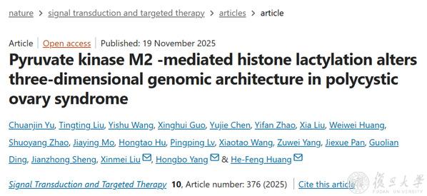 2025年11月19日,复旦大学附属妇产科医院黄荷凤团队在《信号转导与靶向治疗》(Signal Transduction and Targeted Therapy)上在线发表了题为“PKM2-mediated Histone Lactylation Alters Three-dimensional Genomic Architecture in Polycystic Ovary Syndrome”的研究成果。该研究首次指出,在PCOS中,代谢关键分子丙酮酸激酶PKM2作为细胞核内重要的调节因子,诱发乳酸堆积于细胞核内,促进组蛋白乳酸化修饰,进而驱动染色质三维基因组结构全局性改变,导致多囊卵巢综合征(PCOS)的发生。