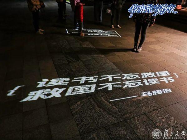 投影在地面的老校长语录随着脚步流转,“好学力行”“为人群服务”的字迹在灯光下显现,与学子们的身影交织重叠,既像是先贤的叮咛在脚下回响,又似校史的印记随步履延伸。