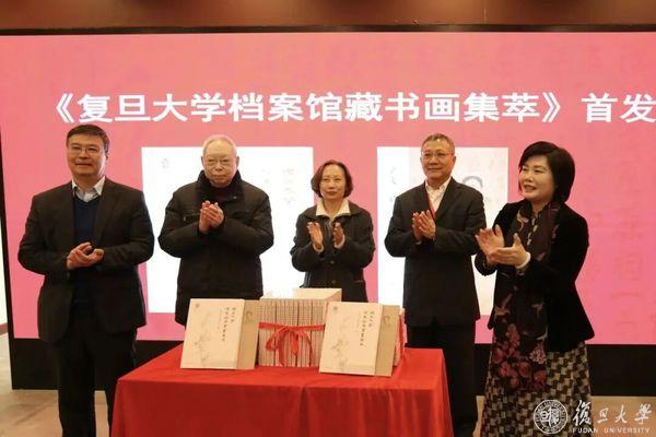 现场同时首发了《复旦大学档案馆藏书画集萃》一书。施方,钱海红,复旦大学出版社党委书记、董事长严峰,复旦大学书画篆刻研究会名誉会长王培南,上海复旦大学校友会常务副会长华彪共同为新书首发揭幕。