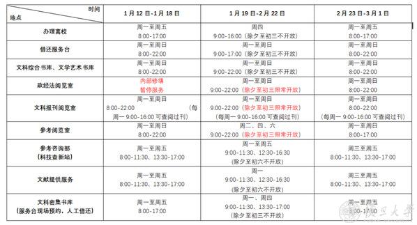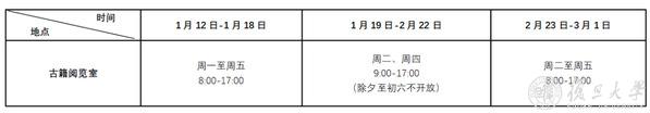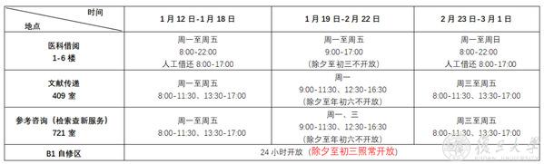 寒假期间,各馆具体开放时间请见附表所示。若在相关阅览室关闭期间需要使用其中书刊资料,请提前和值班老师联系。
