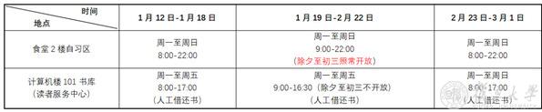 1月11日至2月23日开放第二教学楼二楼,开放时间为8:00-22:30。