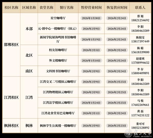 寒假春节期间,“复旦源”各场馆假期安排如下: