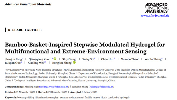复旦大学未来信息创新学院张荣君教授团队和复旦大学附属口腔医院韦晓玲主任团队研发成功用于极端环境和多维感知的水凝胶传感器。近日,相关研究成果以“Bamboo-Basket-Inspired Stepwise Modulated Hydrogel for Multifunctional and Extreme-Environment Sensing”为题发表于国际期刊《先进功能材料》(Advanced Functional Materials)。