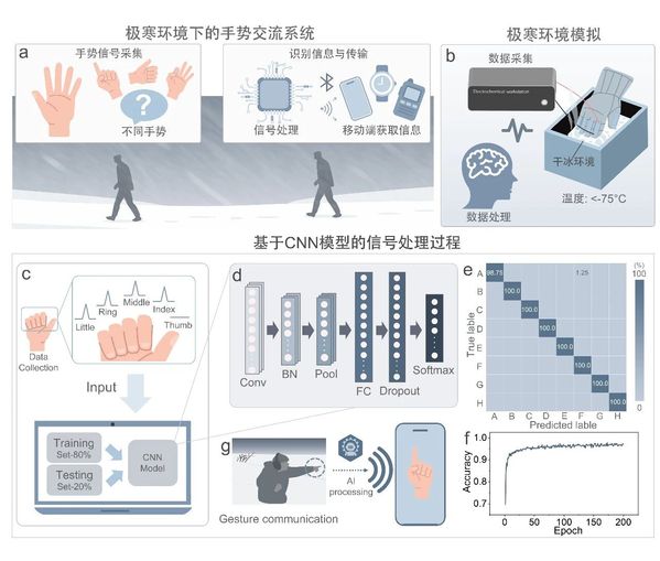 图2 (a)极寒环境手势交流示意图;(b)极寒环境模拟测试示意图;(c)基于CNN模型的信号处理过程