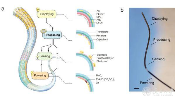 你能否想象未来的衣服能直接播放视频,手套能精准模拟触感,甚至一根细如发丝的纤维就能完成脑电信号的探测与处理?复旦大学纤维电子材料与器件研究院、高分子科学系、先进材料实验室、聚合物分子工程全国重点实验室彭慧胜、陈培宁团队突破传统芯片硅基研究范式,率先提出并制备“纤维芯片”,在弹性的高分子纤维内实现大规模集成电路,成功将供电、传感、显示、信号处理等多功能集成于一根纤维之内,为纤维电子系统开辟全新的集成路径。