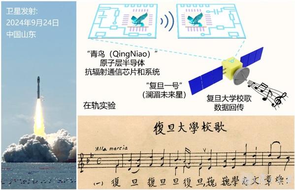 2024年9月24日,“青鸟”通信系统搭载卫星成功发射到距地球约517公里的低地球轨道(LEO)。团队将“复旦大学校歌”的原始手稿照片存入“青鸟”系统的存储器中,并完成了以“复旦大学校歌”为信号的太空星内通信传输,最后经卫星天线发射并返回地面站解码后,“复旦大学校歌”信号复原准确无误。