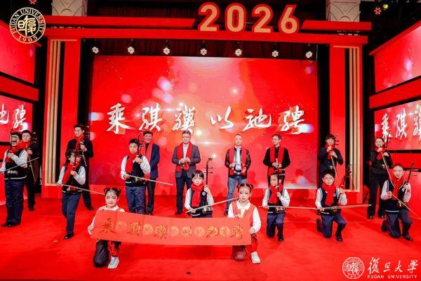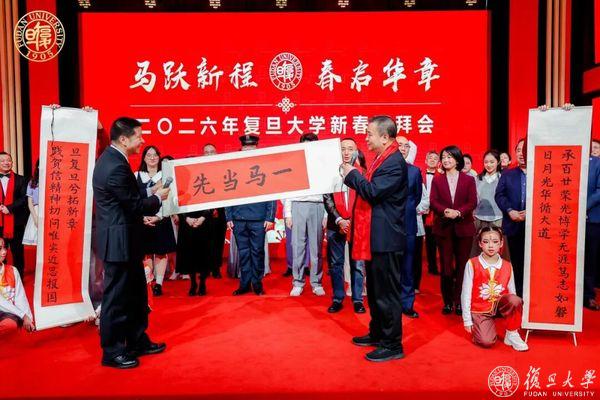 复旦大学党委书记裘新、校长金力在热烈的掌声中登台,为复旦人送上满载祝福的新春对联。
