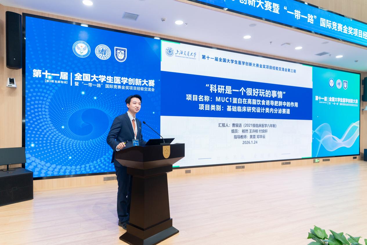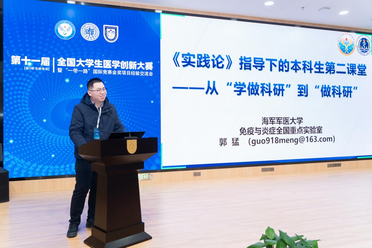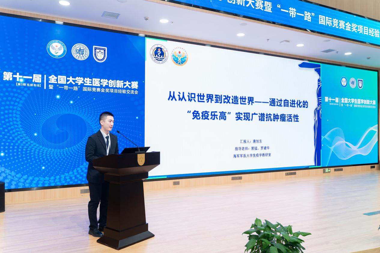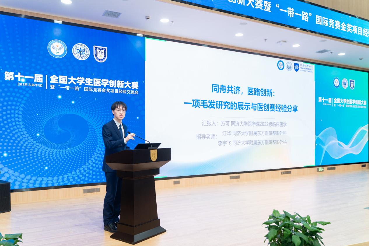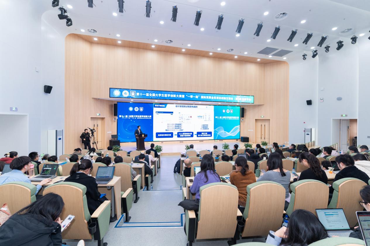 在随后进行的金奖项目经验分享环节中,来自不同赛道、多所高校的优秀学子及导师代表依次发言。口腔医院的李可为、史一格,上海交通大学的曹宸语,同济大学的方可,海军军医大学的唐旭东,以及来自中国药科大学、南京中医药大学、浙江大学、南京医科大学、扬州大学的杜佳豪、于添翼、徐鑫杰、高畅、吴丹妮等同学,分别围绕各自获奖项目进行汇报。