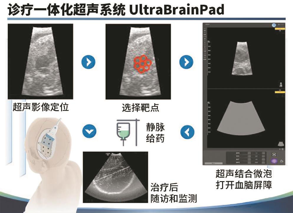此次项目组带来的“中国方案”是第三种方案。它基于超声的半侵入式技术,小型手持式超声探头观察患者脑内情况,超声影像实时呈现在屏幕上,医生在屏幕上手触式选取多个治疗靶点,启动超声波,就可实现所有靶点区域血脑屏障同时打开。该方案操作便捷、成本节约、精准度高,配合AI图像识别技术,能可视化观测到血脑屏障开放程度,安全可靠,在基层医院即可完成相关治疗。