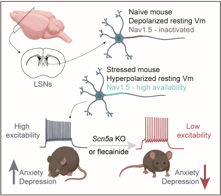 慢性应激相关情绪障碍(如焦虑症、抑郁症)是全球高发的精神健康问题。此类疾病的发病机制复杂,涉及神经元兴奋性失衡、神经环路功能异常等多个层面。电压门控钠通道(NaV)作为调控神经元动作电位产生和传播的核心分子,其亚型功能异常与情绪障碍密切相关。其中,河鲀毒素(TTX)不能阻断(即TTX不敏感)的钠通道NaV1.5(由Scn5a基因编码)在外周心脏电生理和心肌功能中已被广泛研究,但其在脑内的表达模式与功能尚不清楚。以往的原位杂交实验表明,Scn5a也表达于脑内与情绪调控相关的重要脑区(如边缘系统),但其如何影响神经元的兴奋性、是否参与调节情绪行为、能否成为干预负性情绪的离子通道靶点,尚需进一步研究。