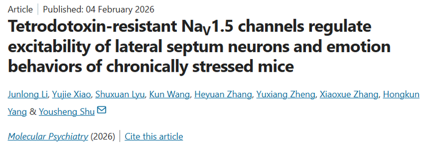 2026年2月4日,复旦大学脑科学转化研究院舒友生团队在Molecular Psychiatry上发表了题为Tetrodotoxin-resistant NaV1.5 channels regulate excitability of lateral septum neurons and emotion behaviors of chronically stressed mice的研究论文。该研究发现,通常被认为主要在心脏表达的NaV1.5,在外侧隔核(Lateral septum, LS)神经元中高丰度表达,并在调控神经元兴奋性和负性情绪中发挥重要作用。