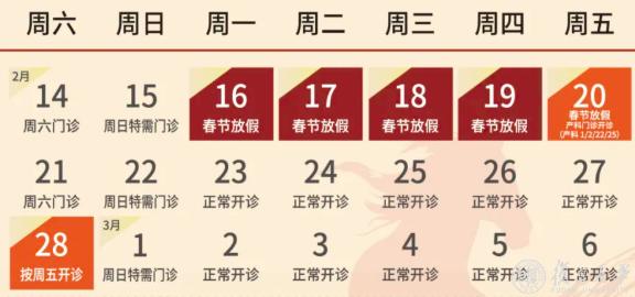 除夕至初二放假(2月16-18日)停诊,儿科门诊正常开诊;急诊,发热门诊24小时开诊;互联网医院以当日排版为准;实行门诊预约制,请提前预约,合理安排您的就诊时间。